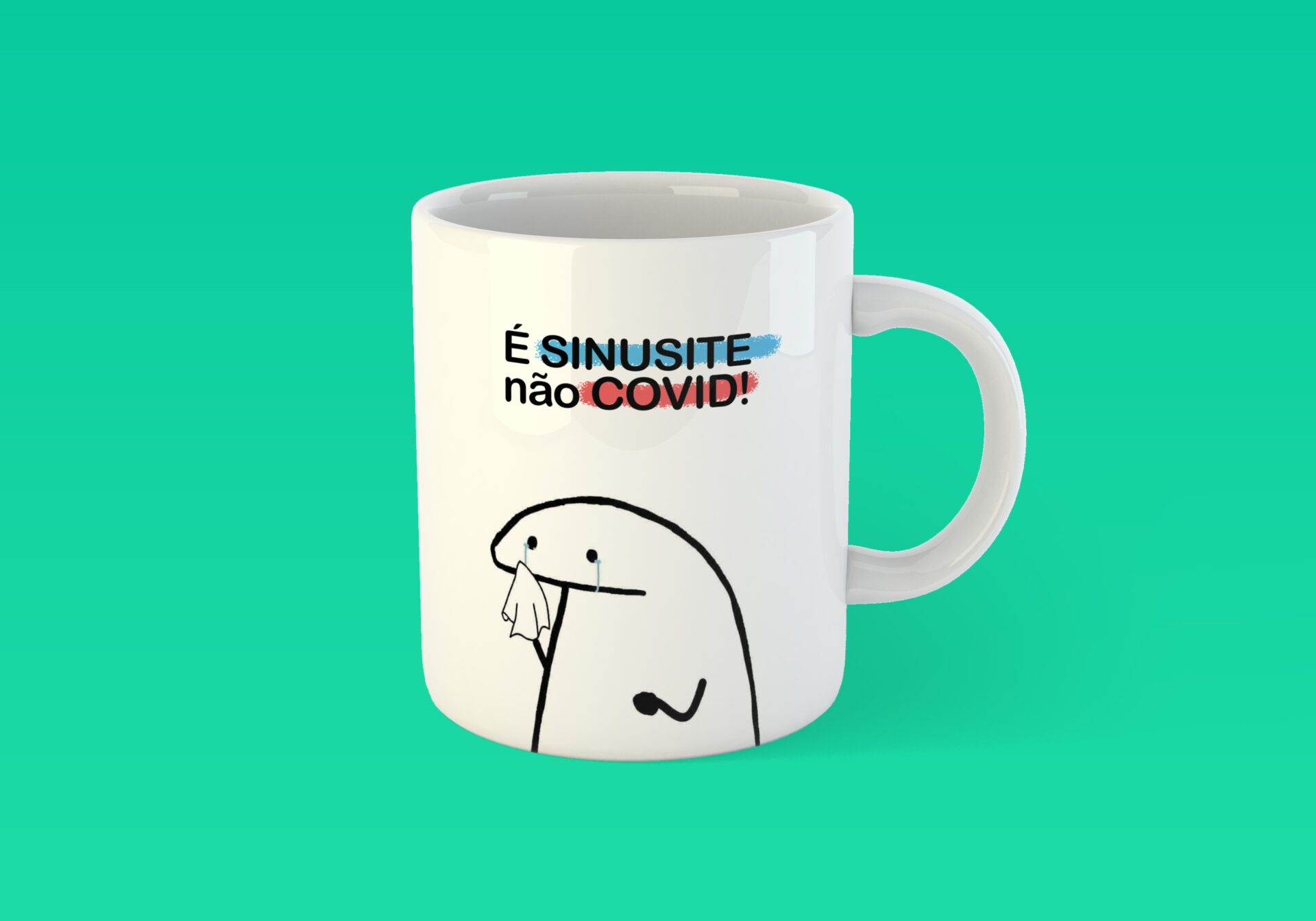 Caneca branca de cerâmica com arte do meme Flork com o texto “A pessoa com sinusite não tem um dia de paz” em um dos lados. Do outro lado com arte do meme Flork com o texto “É Sinusite não COVID!”. Por se tratar de uma peça artesanal a mesma pode apresentar leves diferenças da…