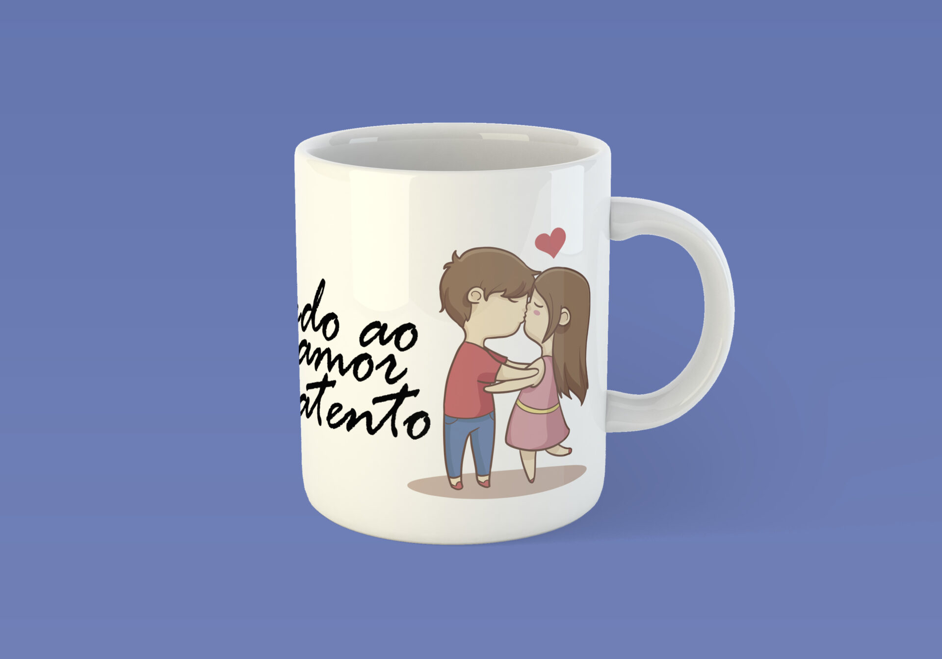 Caneca branca de cerâmica com arte “Casal” em ambos os lados e o texto “De tudo, ao meu amor serei atento” entre as imagens. Por se tratar de uma peça artesanal a mesma pode apresentar leves diferenças da imagem.
