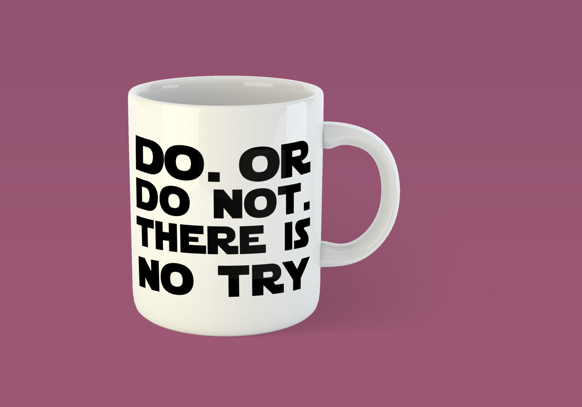 Caneca branca de cerâmica com arte do “Mestre Yoda” em um dos lados e o texto “Do. Or do not. There is no try” do outro lado. Por se tratar de uma peça artesanal a mesma pode apresentar leves diferenças da imagem.